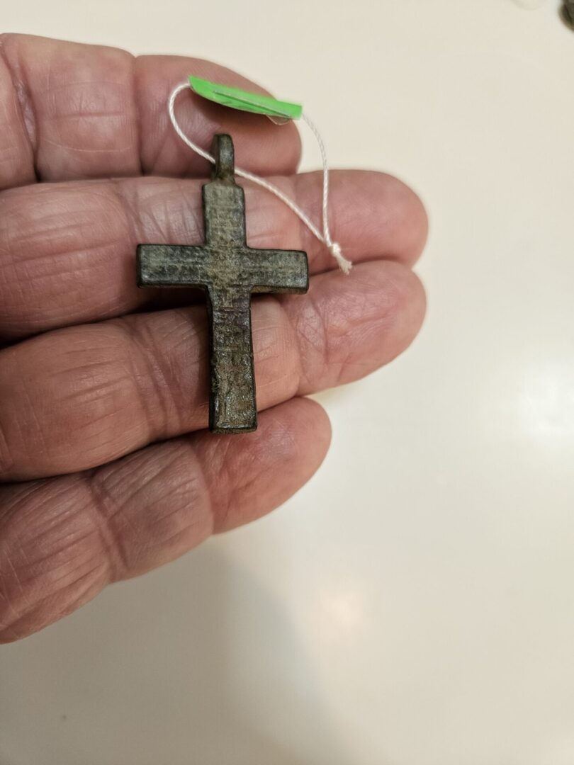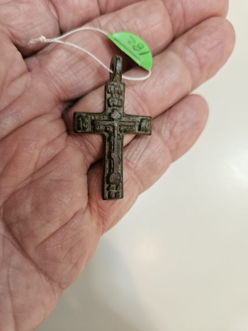 This is a 4-pointed cross with a radiant crown in the middle, the beams are in the form of small rods. On the front is the relief of the 8 ended Golgotha cross with the spear, vinegar stick, and Adam’s skull in the cave. IC and XC are at the top of the beams. The surface under the cross beam has scripture. The back of the cross has a pattern and scripture. Circa 1600s