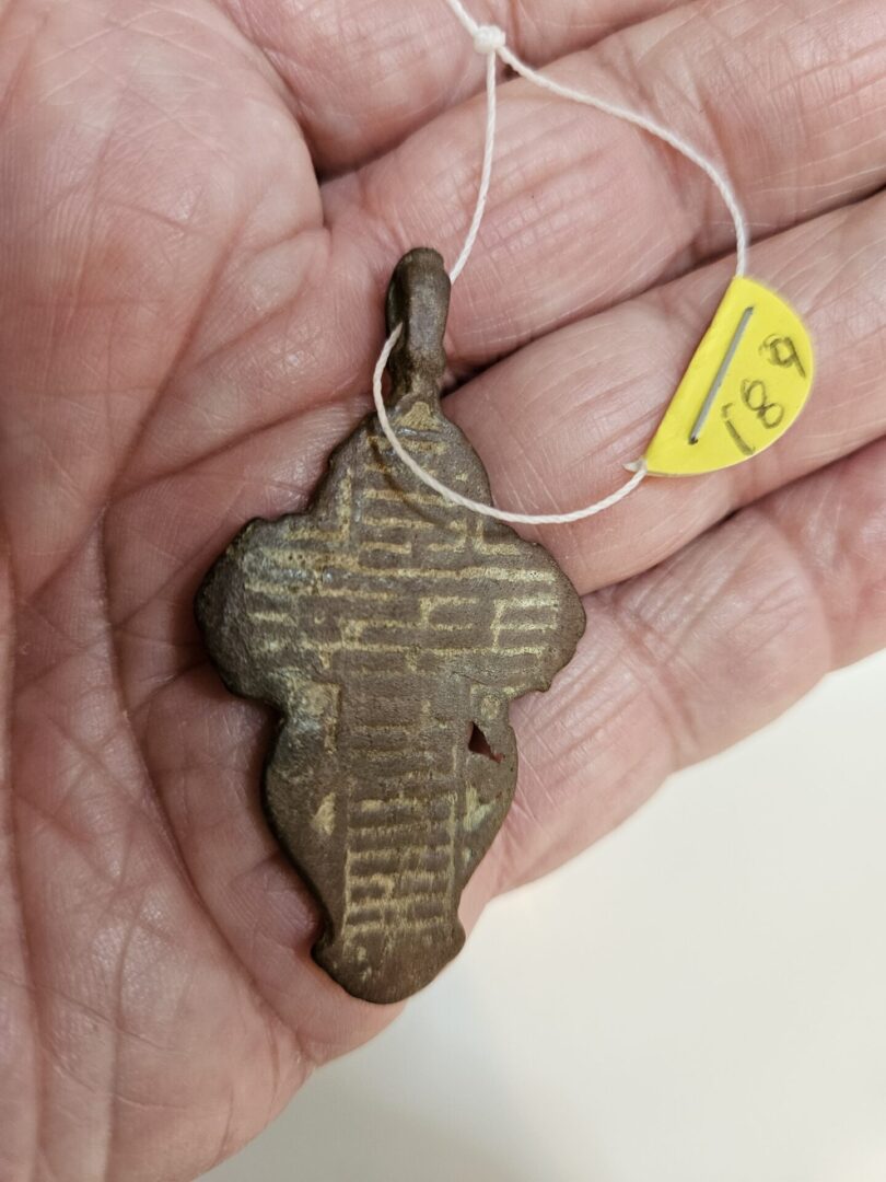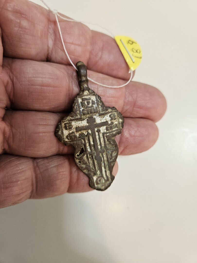 This cross is shaped to represent the wings of the Seraphim, the most important angles and the caretakers of God’s throne. The bail at the top of the cross has three rings which symbolize the Holy Trinity. The eight ended Golgotha cross with the spear and vinegar stick is on the front. The monogram uPbC [King of Glory] is at the top. The monograms IC XC [Jesus Christ] are on the lateral ends of the cross beam and under those are the monograms CHb BXIN [Son of God]. Adam’s skull in the cave is at the foot of the Golgotha cross. The back of the cross has the first verse of Psalm 68 “Let God arise, let His enemies be scattered, also let those that hate Him flee before Him. Circa 1650