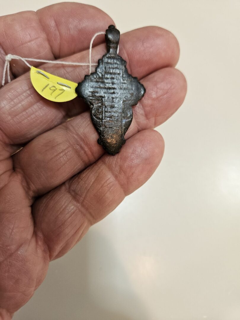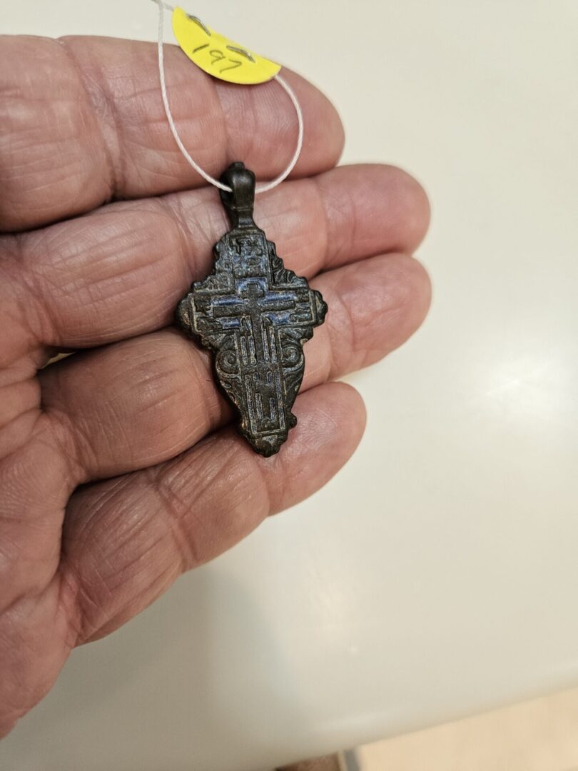 This is an Old Believers Cross. This cross is shaped to represent the wings of the Seraphim, the most important angles and the caretakers of God’s throne. The bail at the top of the cross has three rings which symbolize the Holy Trinity. The eight ended Golgotha cross with the spear and vinegar stick is on the front. The monogram uPbC [King of Glory] is at the top. The monograms IC XC [Jesus Christ] are on the lateral ends of the cross beam and under those are the monograms CHb BXIN [Son of God]. Adam’s skull in the cave is at the foot of the Golgotha cross. The back of the cross has the first verse of Psalm 68 “Let God arise, let His enemies be scattered, also let those that hate Him flee before Him. Circa 1650