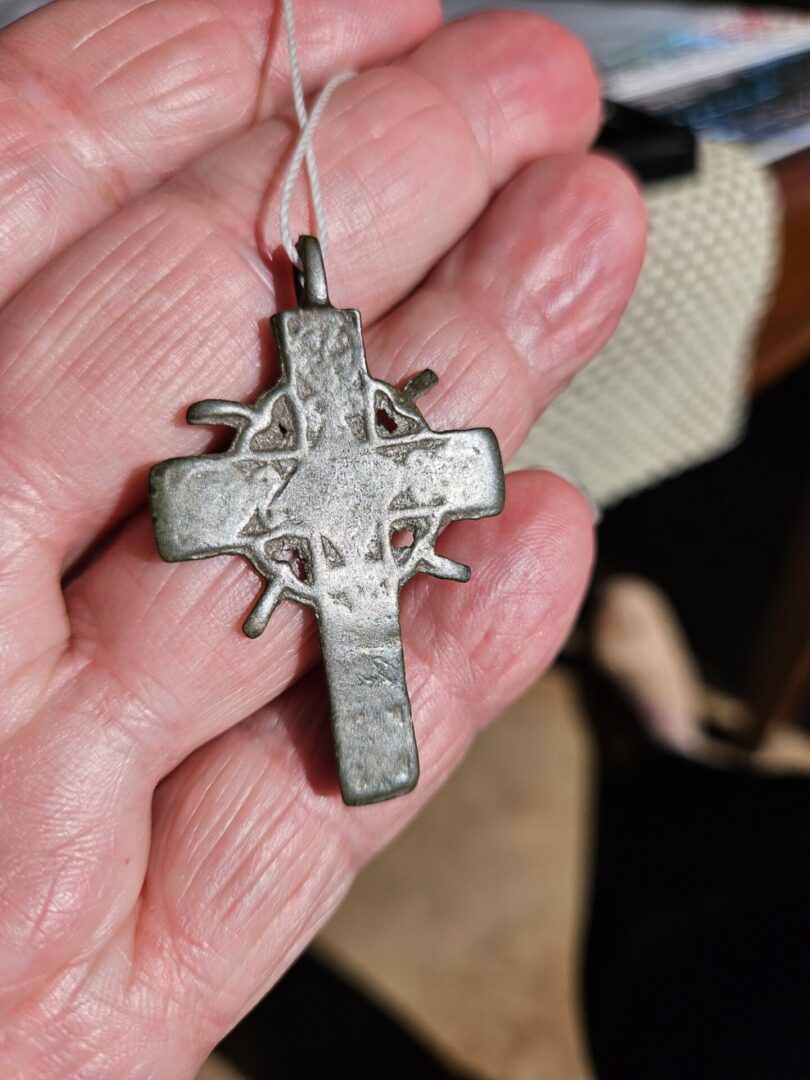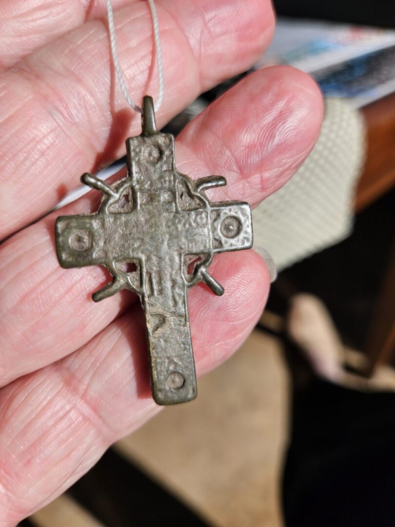 This is a 4-pointed cross with a radiant crown in the middle, the beams are in the form of small rods. On the front is the relief of the 8 ended Golgotha cross with the spear, vinegar stick, and Adam’s skull in the cave. IC and XC are at the end of the beams. The surface around the cross beam has scripture. The back of the cross has a pattern and scripture. Circa 1600s
