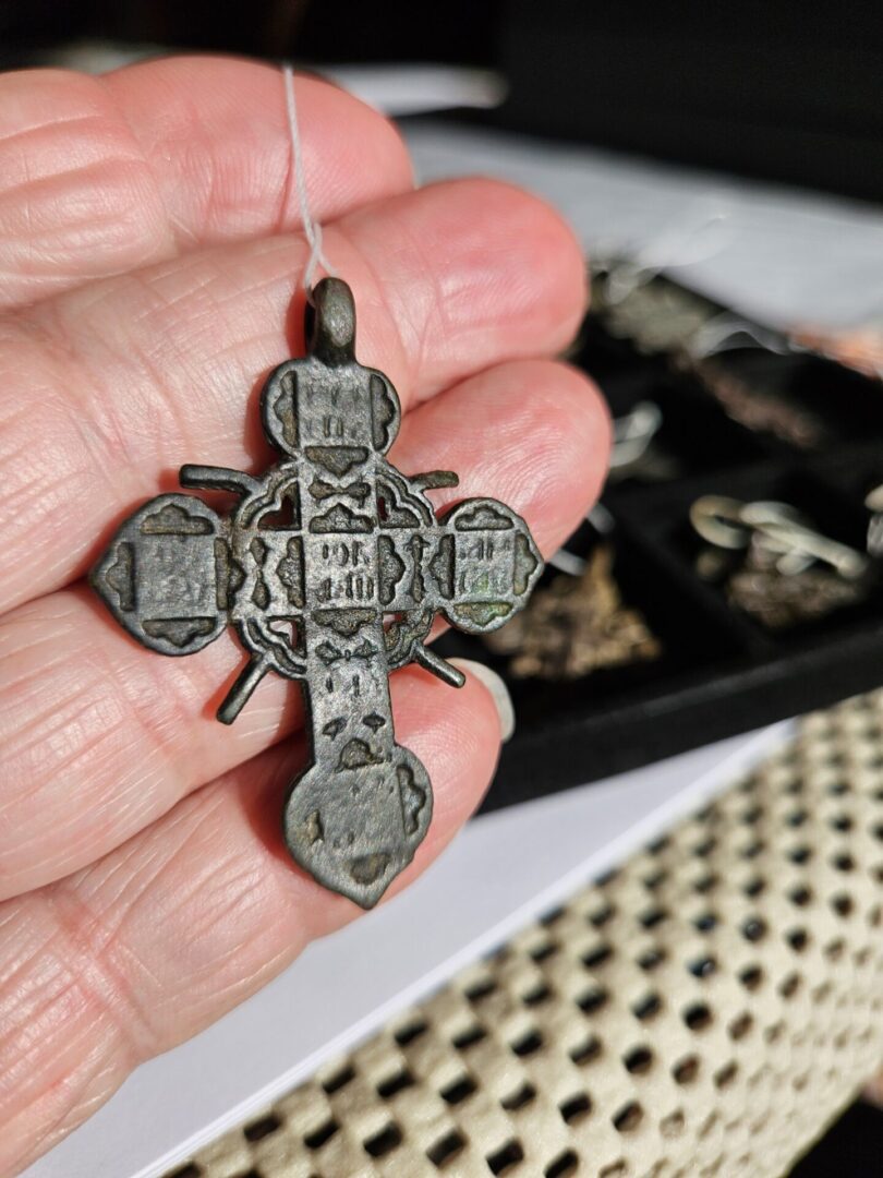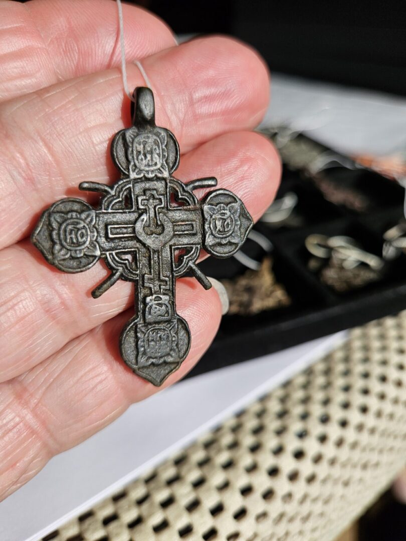 This is a 4-pointed “Old Believers Cross” cross with heart shaped ends and a radiant crown around the middle with beams. On the front face there is the relief of the eight ended Golgotha cross with the spear and vinegar stick and tsata. The panel at the top has UPb CBbl “King of Glory. On the lateral ends there is IC XC in the panel. At the bottom of the cross is Adam’s skull. The bottom panel has “Locus Frontal Kingdom of Heaven Best.[old church Slavonic]. The back of the cross has a pattern and scripture.