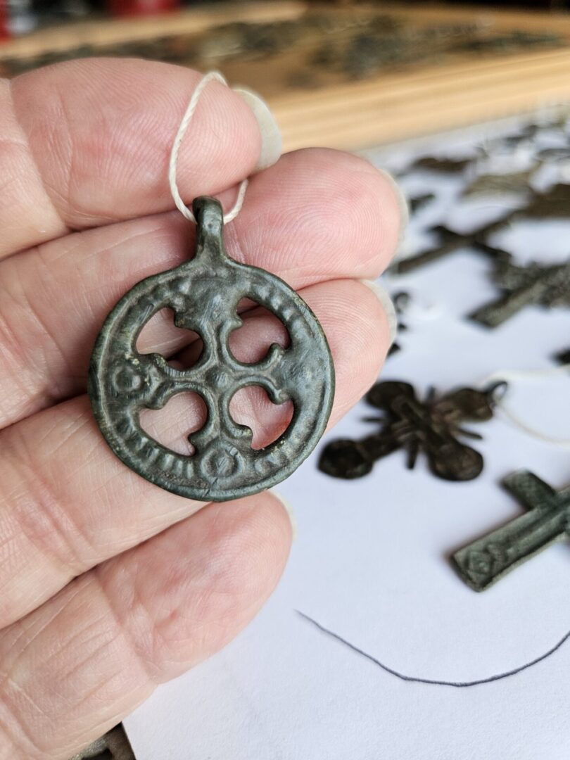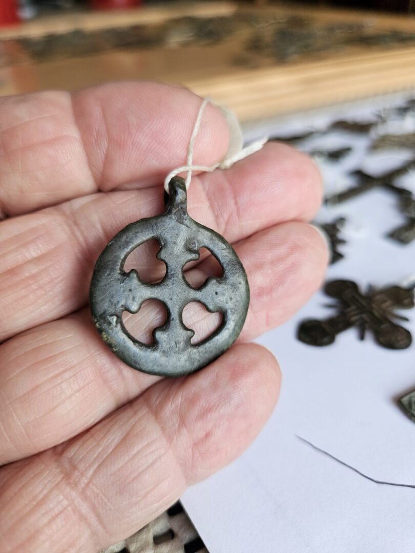 This round pendant has a 4-pointed equilateral cross with a rhombic center and kreen shaped ends that hold 4 of the wounds, the fifth in the center. $425 R3 35-50 known to exist.