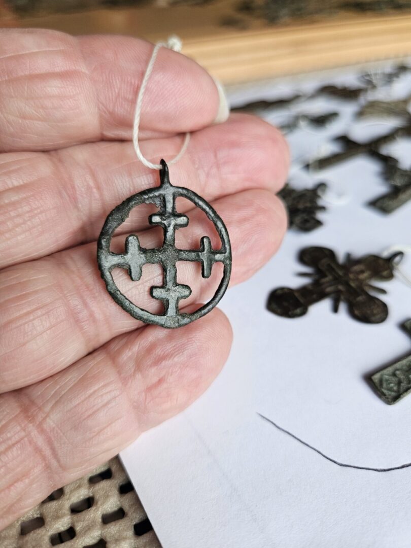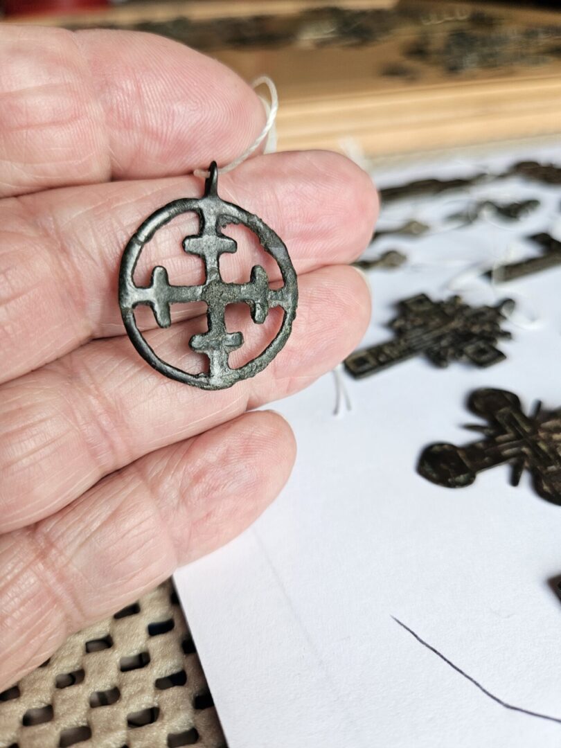 This round pendant has a beaded surface with 5 equilateral crosses in the circle. R3 40-50 of these specimens are known to exist.